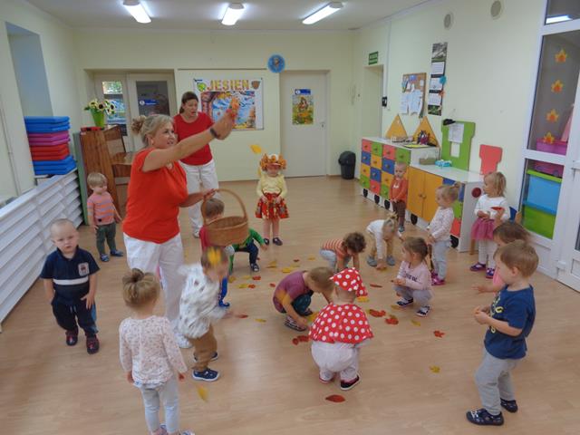Z okazji “Dnia Jesieni” dzieci przyszły ubrane w bluzeczki w jesiennych kolorach. Chętnie brały udział w zabawach ruchowych,zbierały spadające liście i wkładały do koszyka,segregowały żółte i czerwone piłeczki do odpowiednich pojemniczków. Zabawy te miały na celu dostarczenia dzieciom wrażeń wzrokowych i dotykowych oraz utrwalenie żółtego i czerwonego koloru.