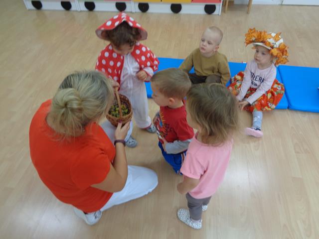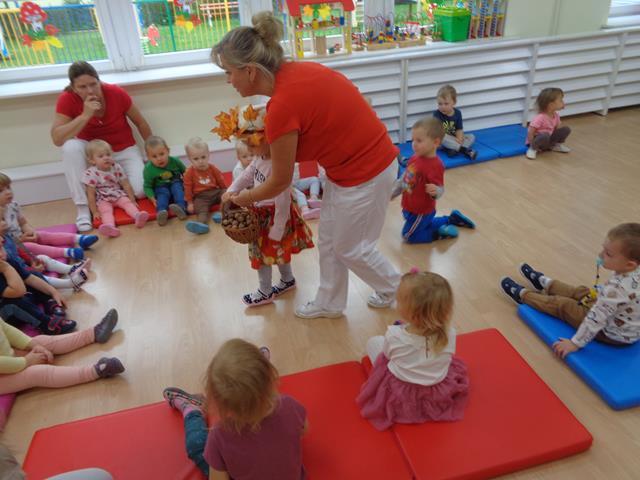 Maluszki z wielkim zaciekawieniem oglądały dary jesieni (kasztany,żołędzie,jarzębinę,kolorowe liście,kosz z owocami). W skupieniu wysłuchały wiersza i piosenek o tematyce jesiennej.