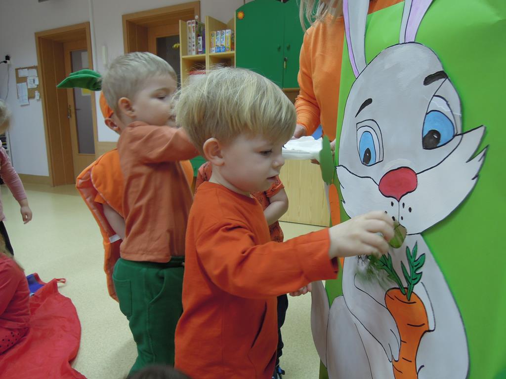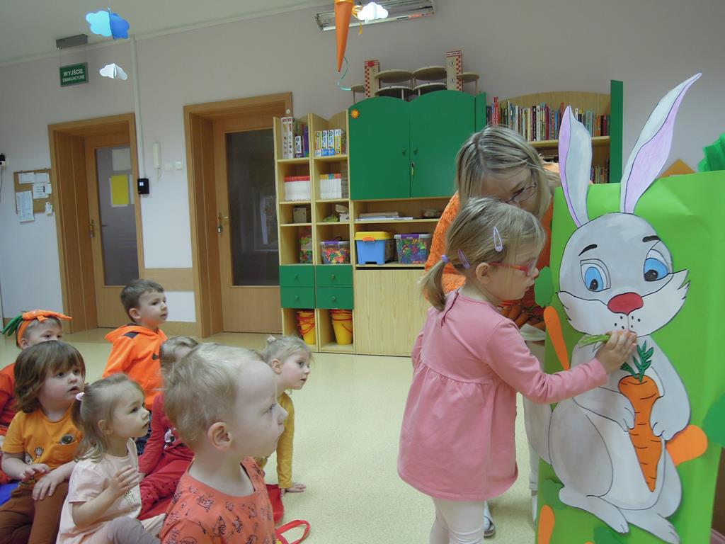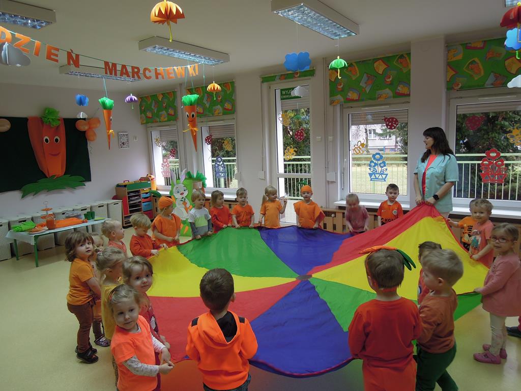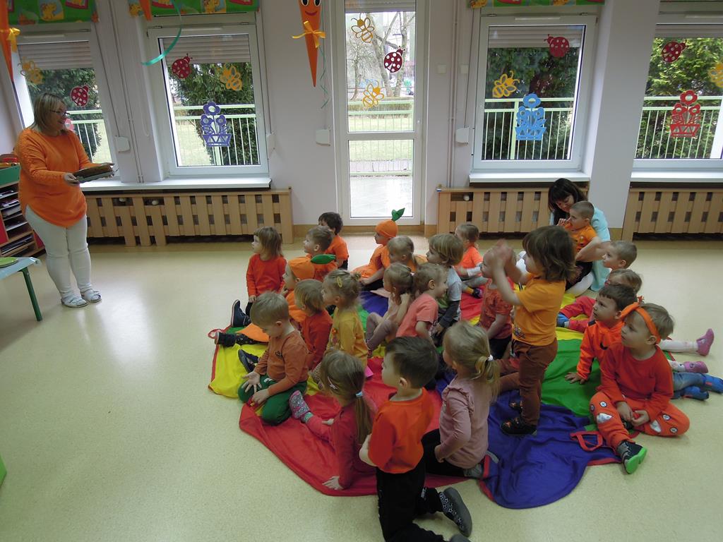 ,,Dzień marchewki’’ było okazją , aby utrwalić kolor pomarańczowy. Głównym celem zajęć było promowanie nawyków prozdrowotnych. W tym dniu dzieci otrzymały specjalne zadanie – nakarmienie marchewką głodnego zajączka. Odbył się bal marchewkowy. Dzieci tańczyły z chustą animacyjną do specjalnie przygotowanej piosenki pt. ,,Na marchewki urodziny”. Po zabawie ruchowej udaliśmy się na poczęstunek- ciasto marchewkowe i sok. Święto uwieczniliśmy pamiątkowym zdjęciem w marchewkowej fotobudce.