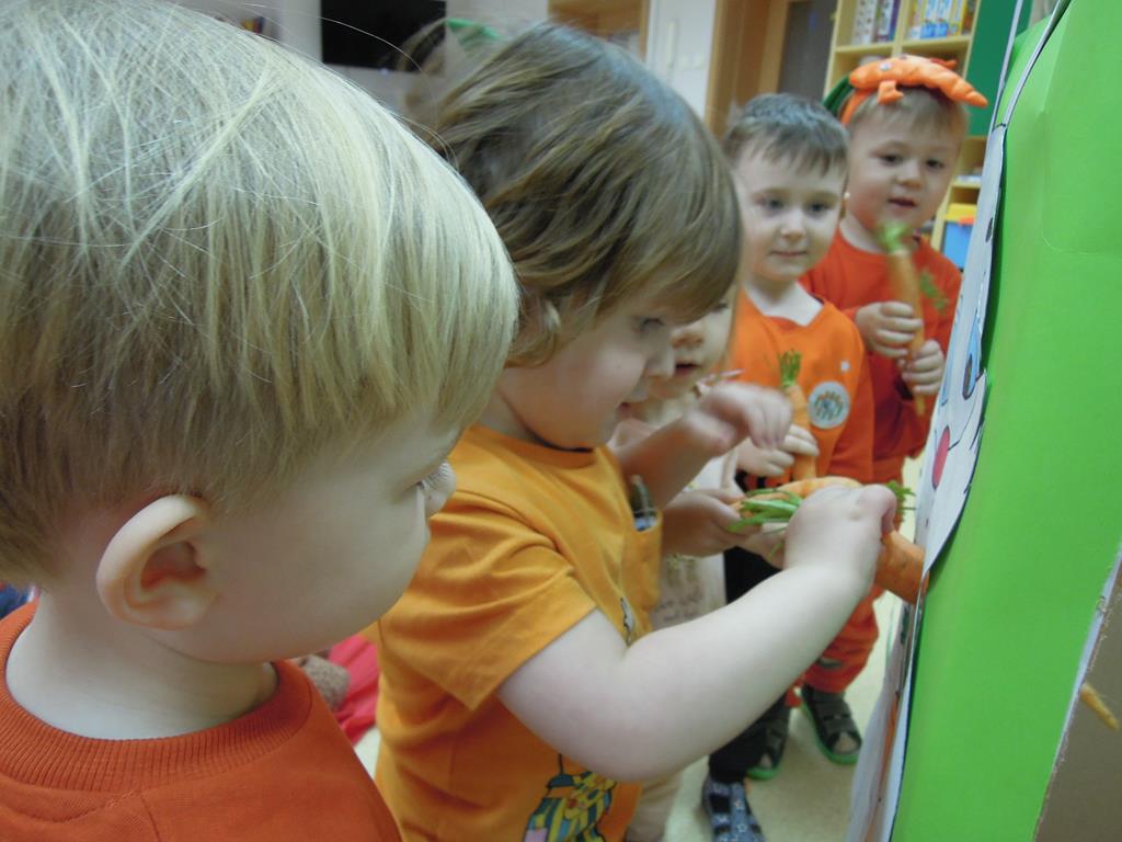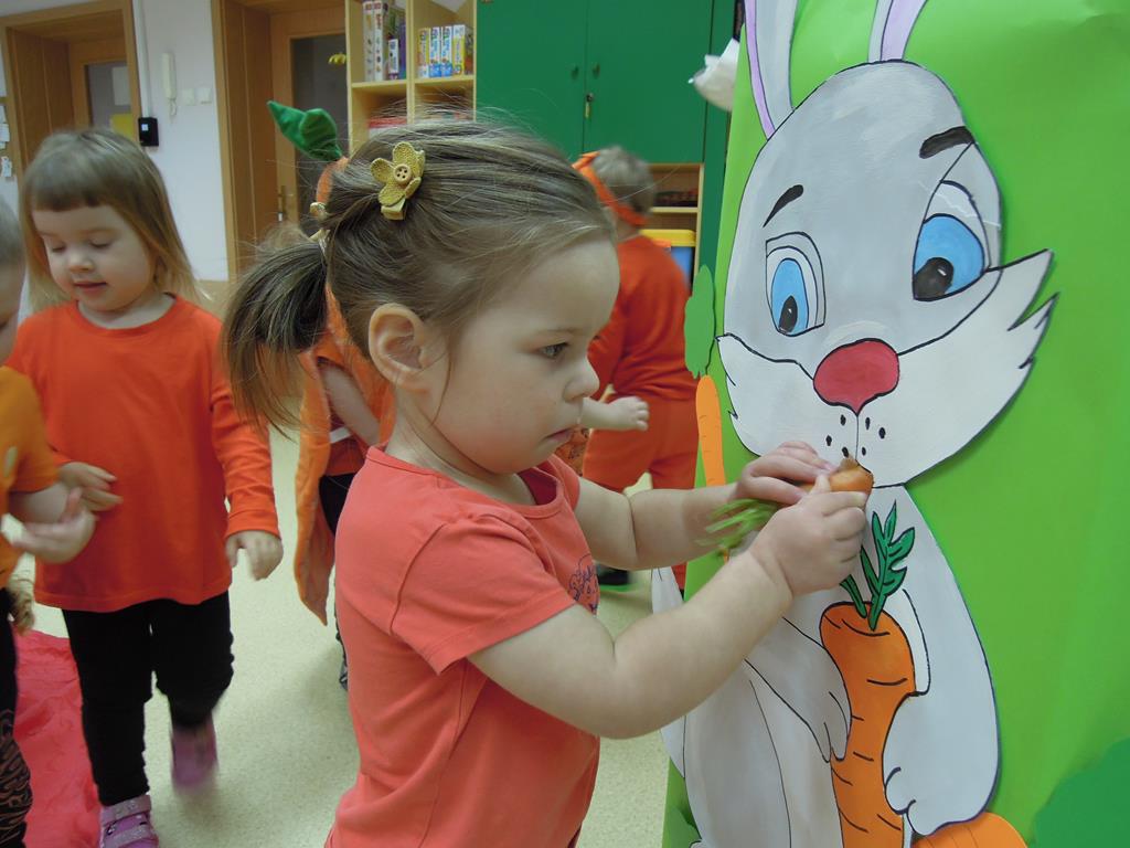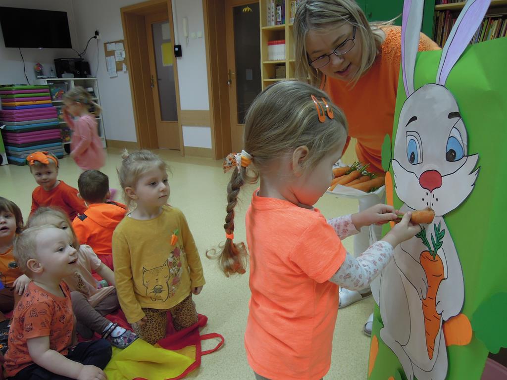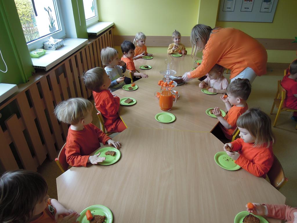 ,,Dzień marchewki’’ było okazją , aby utrwalić kolor pomarańczowy. Głównym celem zajęć było promowanie nawyków prozdrowotnych. W tym dniu dzieci otrzymały specjalne zadanie – nakarmienie marchewką głodnego zajączka. Odbył się bal marchewkowy. Dzieci tańczyły z chustą animacyjną do specjalnie przygotowanej piosenki pt. ,,Na marchewki urodziny”. Po zabawie ruchowej udaliśmy się na poczęstunek- ciasto marchewkowe i sok. Święto uwieczniliśmy pamiątkowym zdjęciem w marchewkowej fotobudce.