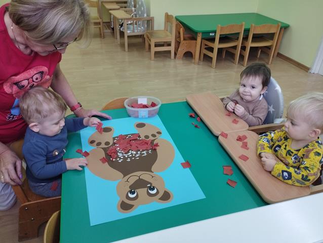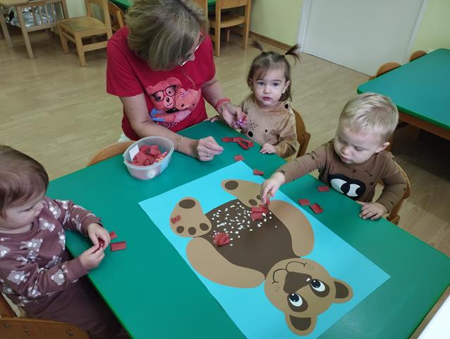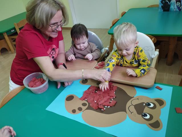 Dzieci wykonały także pracę plastyczną polegającą na wyklejaniu brzuszka misia brązową bibułą. W podziękowaniu za wspaniałą wspólną zabawę maluszki otrzymały pamiątkowe laurki z misiem.