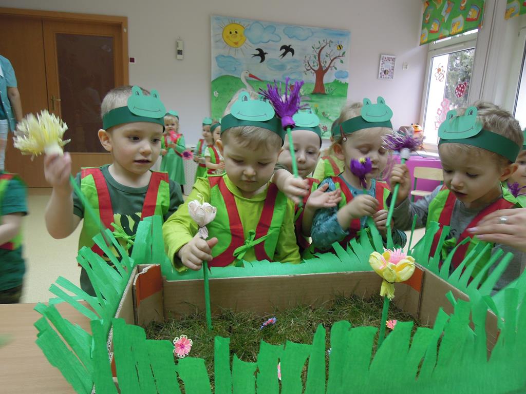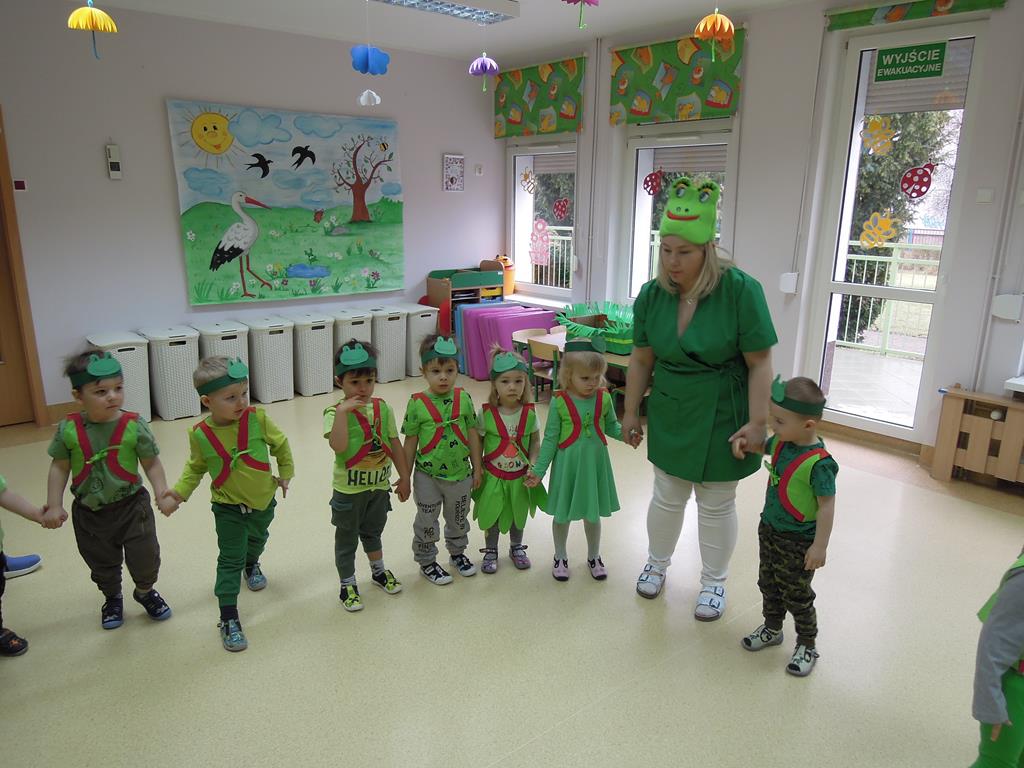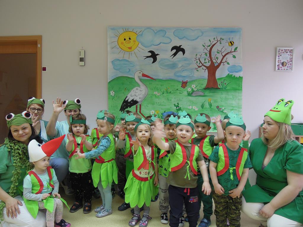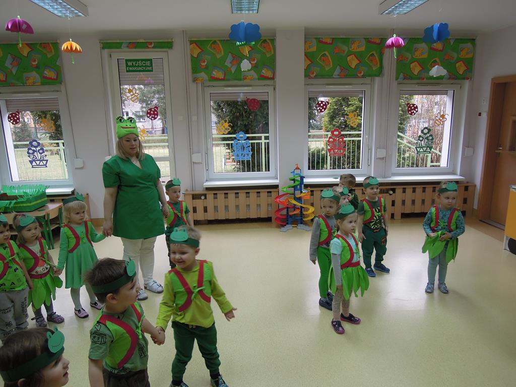 Dziś w grupie III ,,Muchomorki’’ świętowaliśmy ,,Dzień Żabki”. Dzieci przebrane w kostiumy i przygotowane przez rodziców ubranka w kolorze zielonym zaczarowały salę w wiosenną łąkę. Na łące szukały chronienia przed bocianem. Poprzez zabawę odkrywczą nasze starszaki utrwalały liczenie do pięciu. Wspólnie stworzyły swoją kwiatową łąkę specjalnie przygotowanymi kwiatkami. Odbyły się także żabie harce do piosenek m.in. ,, Żabka mała”, Jesteśmy żaby”. Podczas zabawy wszystkim dopisywał świetny humor.
