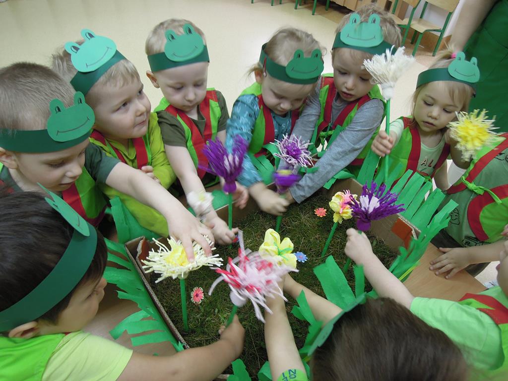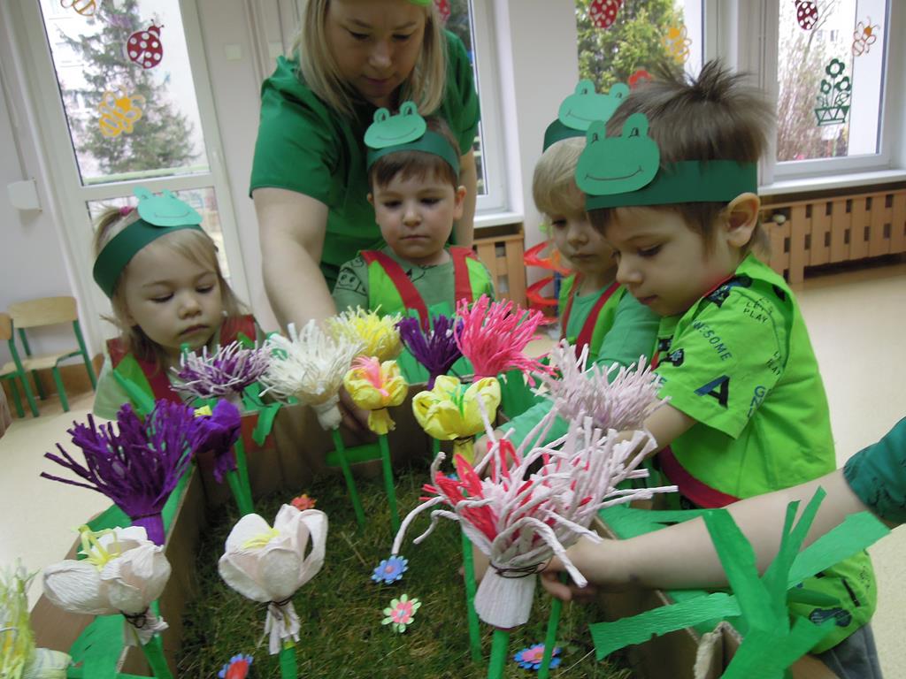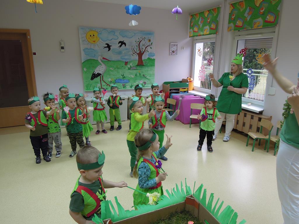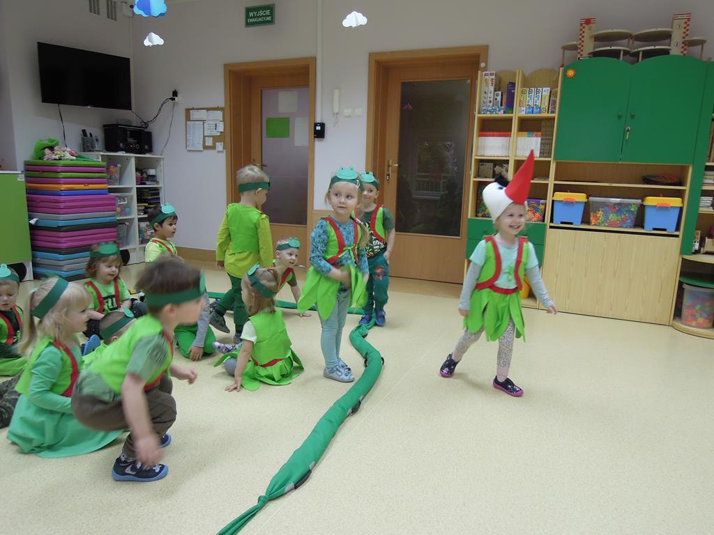 Dziś w grupie III ,,Muchomorki’’ świętowaliśmy ,,Dzień Żabki”. Dzieci przebrane w kostiumy i przygotowane przez rodziców ubranka w kolorze zielonym zaczarowały salę w wiosenną łąkę. Na łące szukały chronienia przed bocianem. Poprzez zabawę odkrywczą nasze starszaki utrwalały liczenie do pięciu. Wspólnie stworzyły swoją kwiatową łąkę specjalnie przygotowanymi kwiatkami. Odbyły się także żabie harce do piosenek m.in. ,, Żabka mała”, Jesteśmy żaby”. Podczas zabawy wszystkim dopisywał świetny humor.
