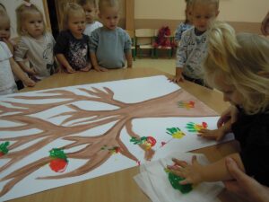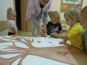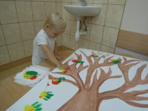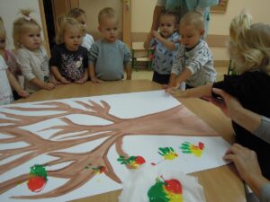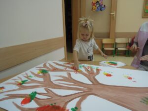 W tym tygodniu dzieci dowiedziały się, jak wygląda jesień w naszym ogrodzie żłobkowymi (częściej wieje wiatr, liście stają się kolorowe i spadają z drzew). To wyjątkowa pora roku. Wyróżnia się pięknymi kolorami, które zmieniają dynamicznie. Dzieci wykonały pracę plastyczną ,, Jesienne drzewo” oraz śpiewały piosenki o tematyce jesiennej,, Pada deszczyk”, ,, Wyszła Ola na spacerek”, ,, Na polanie w lesie”.
