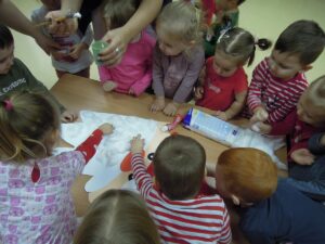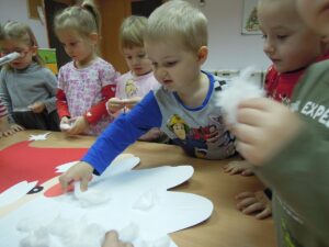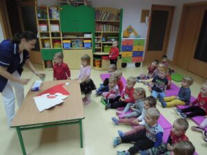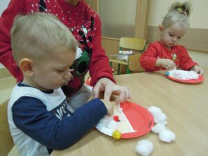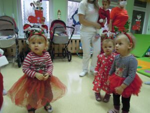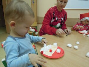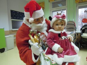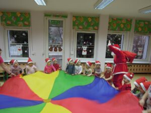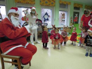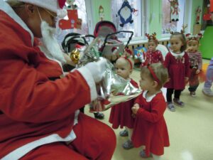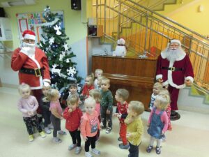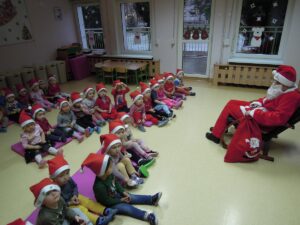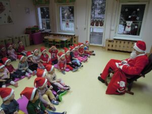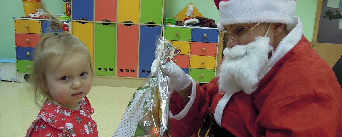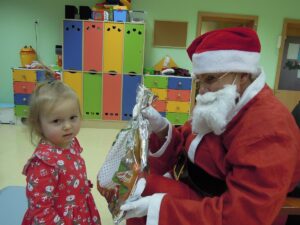 Dziś, 6 grudnia w naszym żłobku pojawił się długo oczekiwany gość – święty Mikołaj . Dzieci cierpliwie czekały na jego wizytę . Powitaliśmy św. Mikołaja wierszem i piosenką. Dzieci w prezencie dla gościa wykonały pracę plastyczną. Spotkanie z Mikołajem minęło w bardzo miłej atmosferze i przyniosła dzieciom wiele radości. Św. Mikołaj obdarował wszystkie dzieci prezentami. Cieszymy się, że o nas pamiętał i czekamy na jego wizytę w przyszłym roku.