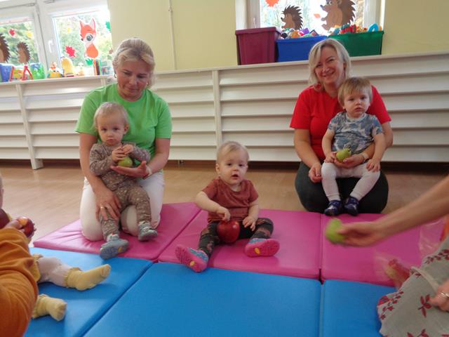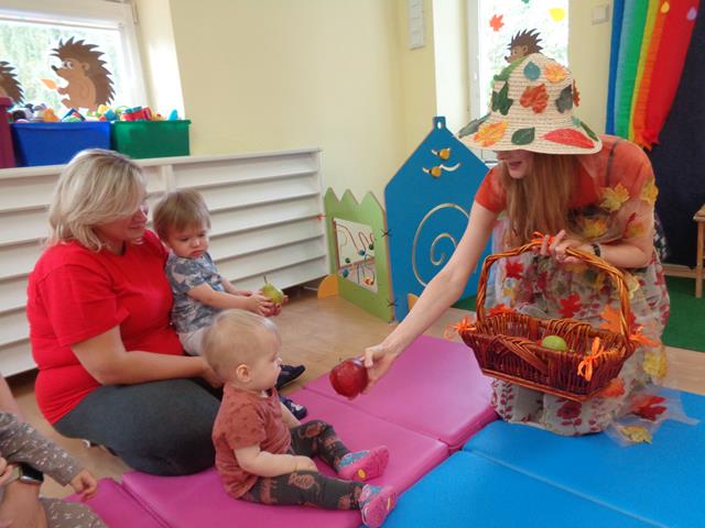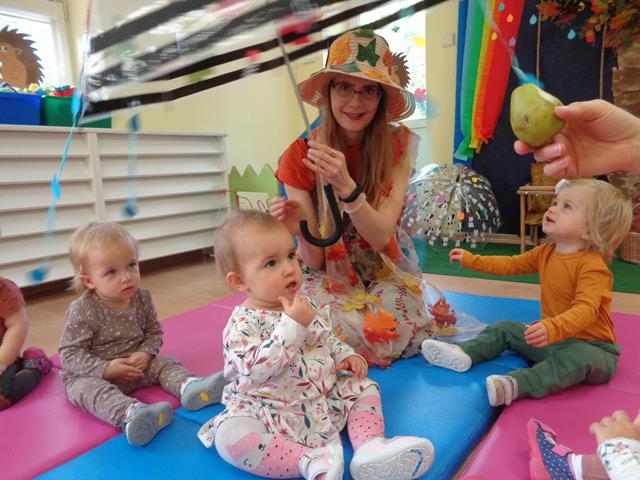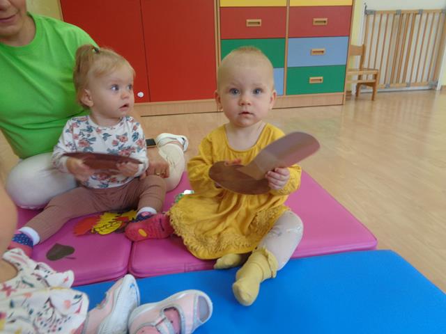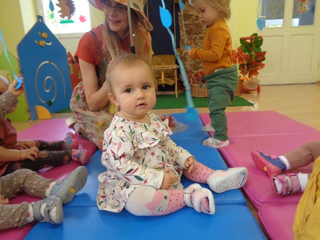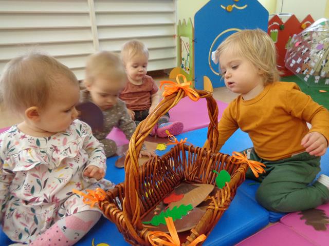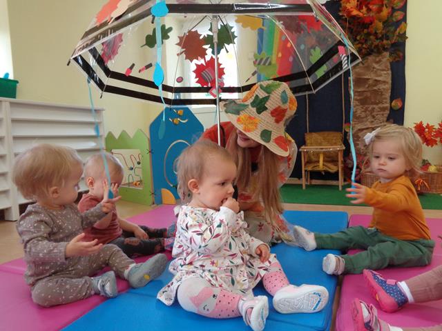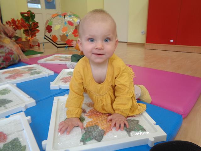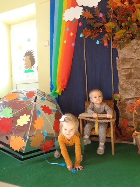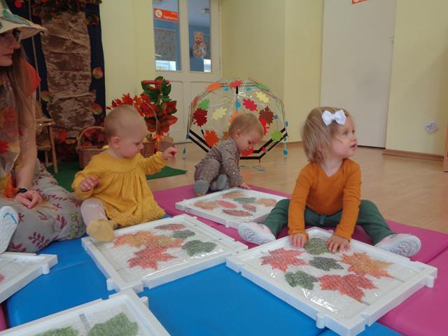 Maluszki z grupy „Raczki”powitały nową porę roku radośnie i w dobrych humorach.W sali królowały kolory jesieni-żółty,pomarańczowy,brązowy oraz czerwony. Dzieci zapoznały się ze skarbami jakie przyniosła nam Pani Jesień,a następnie z uśmiechem i odwagą bawiliśmy się przy jesiennych piosenkach,łapaliśmy kropelki deszczu oraz zbieraliśmy liście i grzyby do koszyczka. Następnie z radością ćwiczyliśmy sprawność małych rączek i nóżek poprzez udział w zabawie sensorycznej z folią bąbelkową.