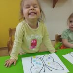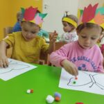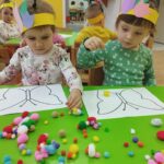 Dzieci poznały też nazwy kwiatów i ptaków, których przybycie zwiastuje wiosenne ocieplenie. Maluszki ćwiczyły sprawność manualną paluszków dekorując pomponikami sylwetki motylków, a kolorowe stroje i wiosennie przystrojona sala wywołały uśmiechy na twarzach dzieci.