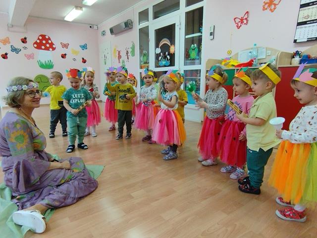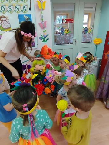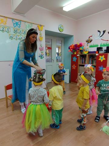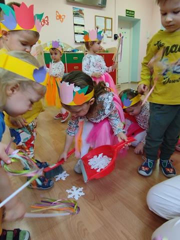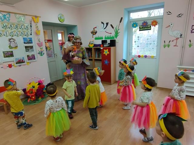 W związku z nadejściem nowej pory roku maluszki z grupy Muchomorków pożegnały zimę i wyruszyły na poszukiwanie wiosny. Odgłosami dzwoneczków obudziły Panią Wiosnę i wspólnie tańcami ze śpiewem radowały się z jej przybycia.