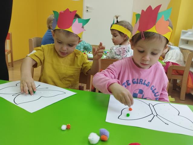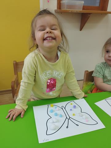Dzieci poznały też nazwy kwiatów i ptaków, których przybycie zwiastuje wiosenne ocieplenie. Maluszki ćwiczyły sprawność manualną paluszków dekorując pomponikami sylwetki motylków, a kolorowe stroje i wiosennie przystrojona sala wywołały uśmiechy na twarzach dzieci.