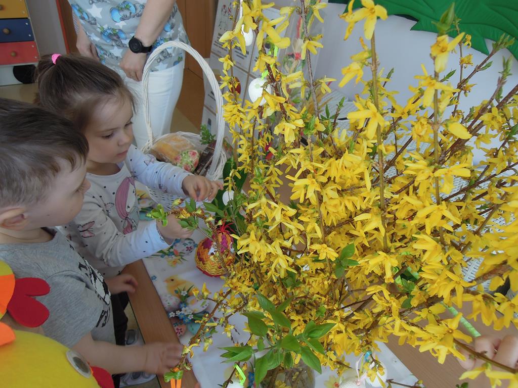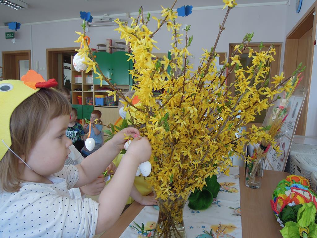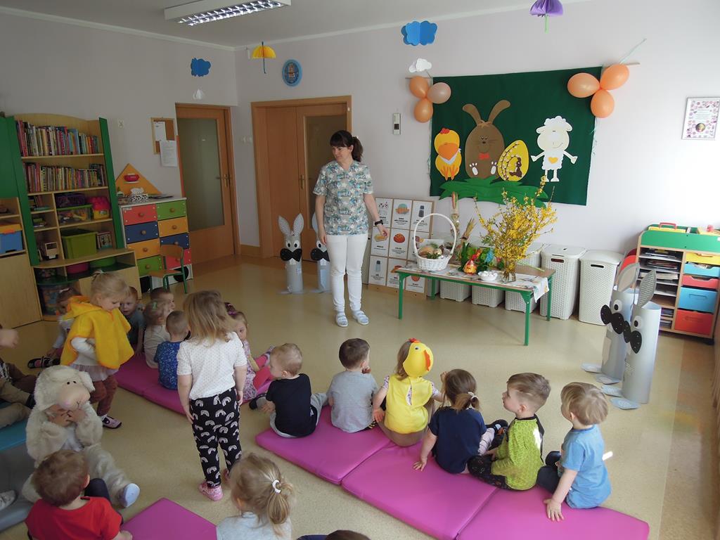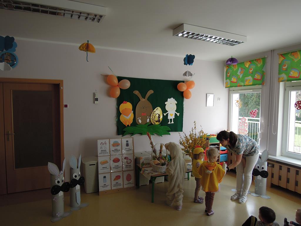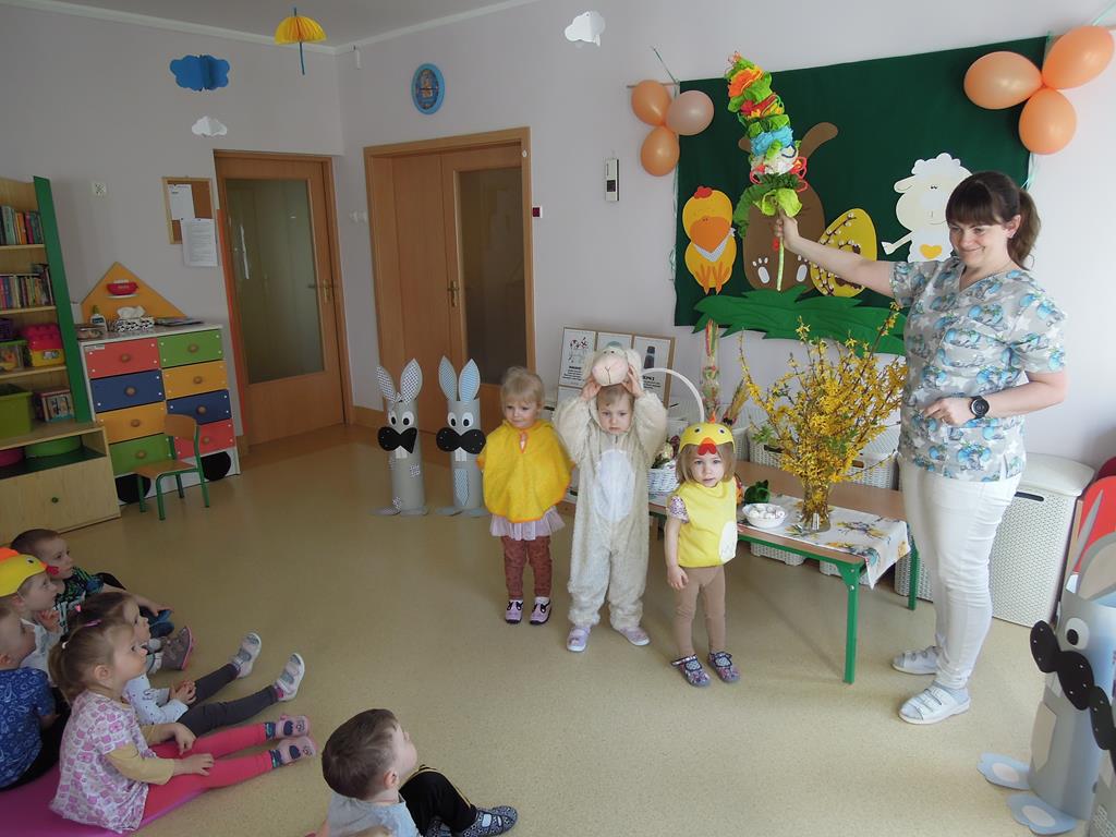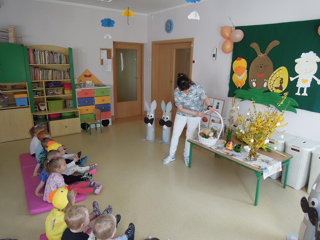 Dziś nasze ,, Muchomorki” poznawały tradycje związane ze zbliżającymi się Świętami Wielkanocnymi. Dowiedziały się jak przygotować świąteczne pisanki . Wspólnie odkrywały i nazywały produkty ukryte w koszyczku wielkanocnym. Zabawa bardzo spodobała się dzieciom wprowadzając nas w świąteczny nastrój. A przygotowane na tę okazję stroje sprawiły, że na buzi niejednego maluszka pojawił się radosny uśmiech.