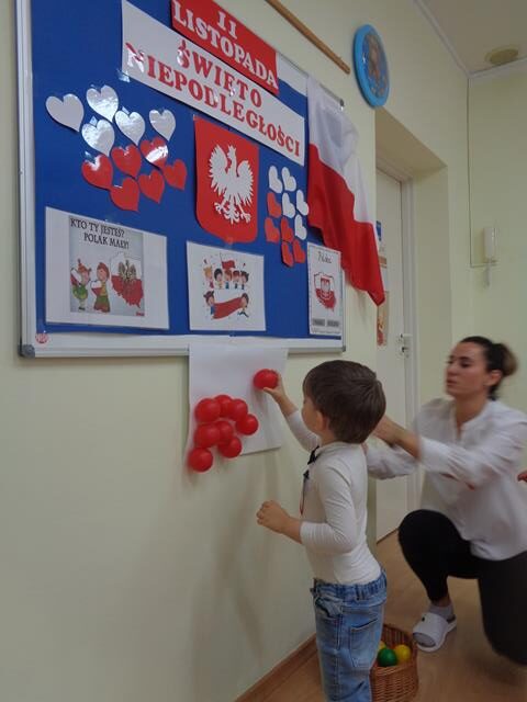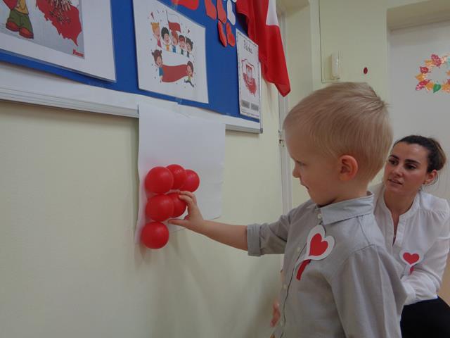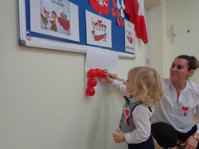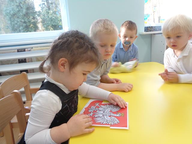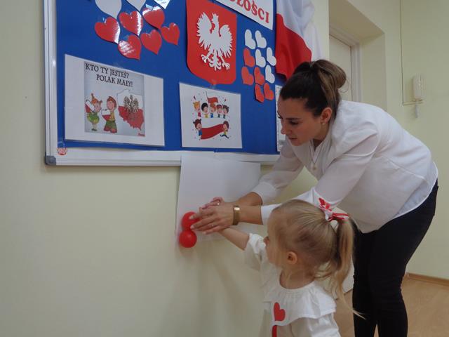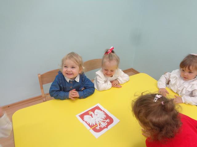 Maluszki poznały nasze narodowe symbole (godło, flaga,hymn) i wspólnie wykonały piękną flagę Polski. Nie zabrakło zabaw ruchowych przy piosenkach pt.: „Jesteśmy Polką i Polakiem”, „Poleczka”.