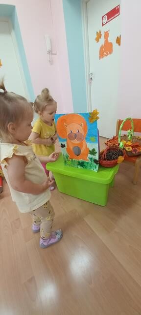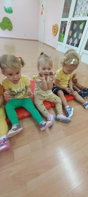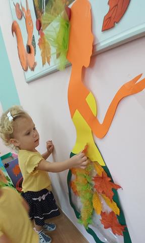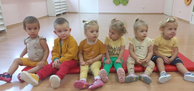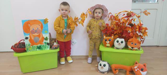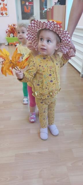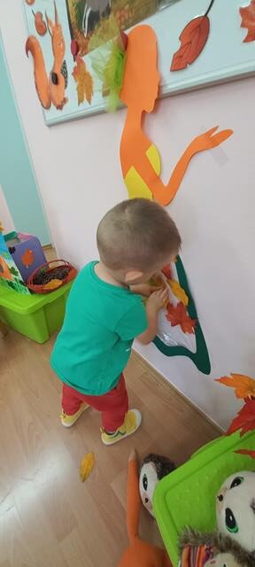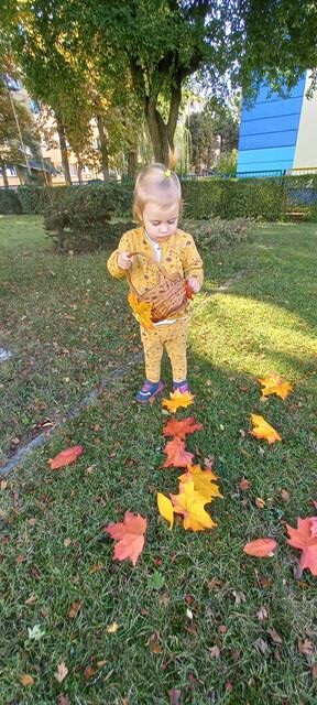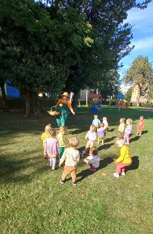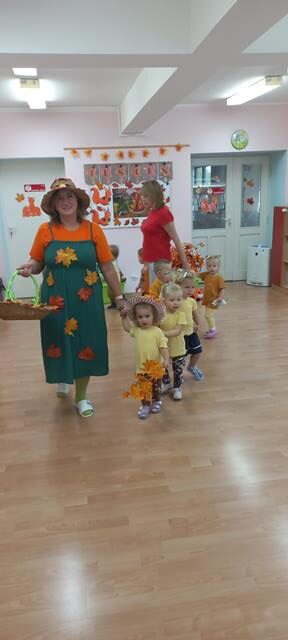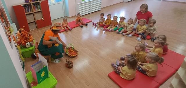 Do naszego żłobka przybyła Pani Jesień. Maluszki z grupy Muchomorków przywitały ją bardzo ciepło i serdecznie. Pani Jesień przyniosła ze sobą olbrzymi kosz pełen darów pochodzących z lasu, sadu i ogrodu. Dzieci aktywnie uczestniczyły w zabawach muzyczno-ruchowych do piosenek “Muchomorek”, “Pani Jesień” i “Kolorowe listki”, z chęcią wystukiwały rytm orzeszkami do piosenki “ Orzeszkami gram”. Podczas zajęć rozwijaliśmy także ekspresję plastyczną i myślenie twórcze – maluszki wykleiły kolorowymi listkami spódnicę Pani Jesieni. Najwięcej radości sprawiło dzieciom szukanie oznak nowej pory roku w żłobkowym ogrodzie. Celem zajęć zabawowych było rozbudzanie zainteresowania przyrodą, wzbudzanie ciekawości u dzieci, a także doskonalenie mowy i sprawności manualnych.