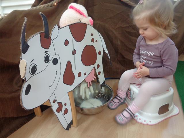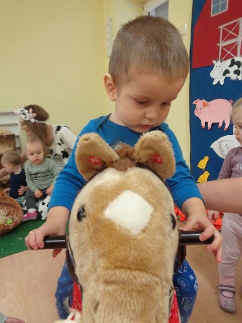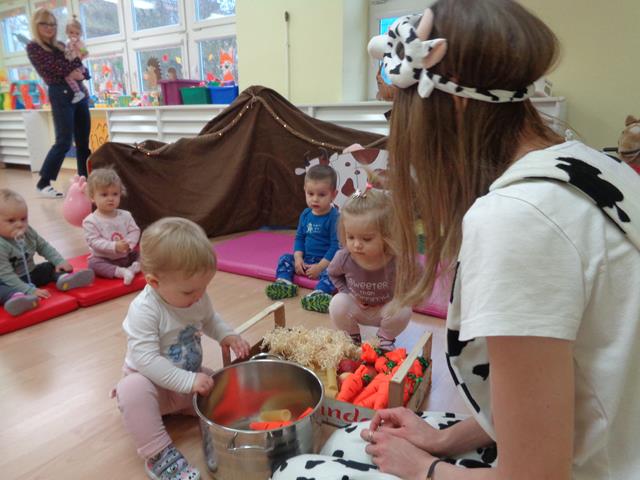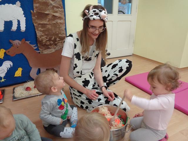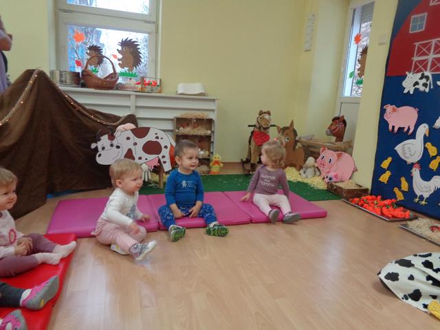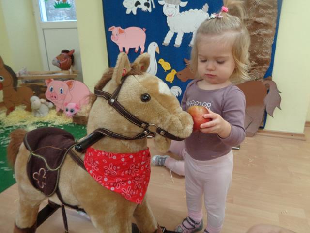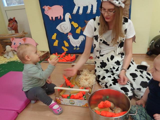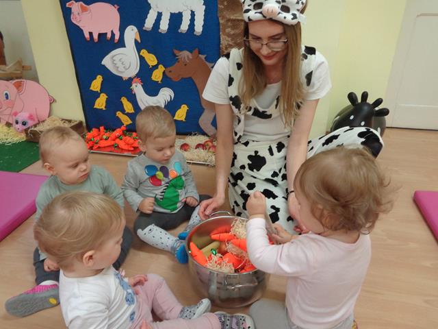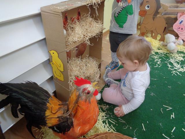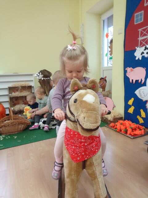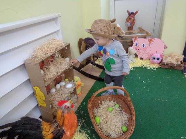 W czasie zajęć zabawowych w grupie Raczków maluszki poprzez zabawę zdobywały wiadomości na temat zwierząt na wiejskim podwórku. Na farmie z zaciekawieniem wysłuchały bajeczki pt.”W gospodarstwie”, co przyczyniło się do rozwoju mowy dzieci. Próby naśladowania odgłosów zwierząt: krowy,konia,świnki oraz kurki to świetna zabawa logopedyczna. Odgrywanie ról kucharzy pozwoliło nam rozwijać motorykę małą poprzez przesypywanie,mieszanie oraz dotykanie różnych produktów. Największe zainteresowanie wzbudziły u maluszków zabawy ze zwierzątkami, karmienie, głaskanie, jeżdżenie na koniku oraz zbieranie jajeczek.Dzień minął w pełnej wrażeń i uśmiechu atmosferze.
